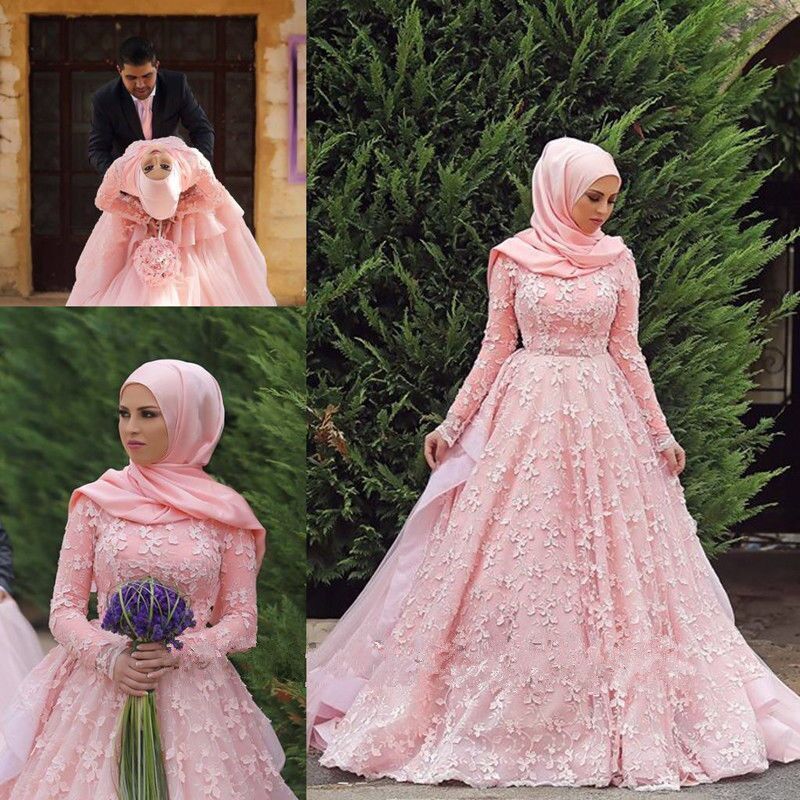 Vestidos De Noiva Bride Dress Pink Ball Gown Princess Lace Muslim Wedding Dress Long Sleeve Vintage Hijab Wedding Dress 2019