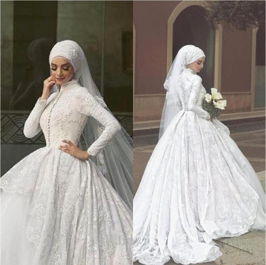 Details About Amazing Lace Muslim Wedding Dresses 2019 High Neck Long Sleeve White Bridal Gown