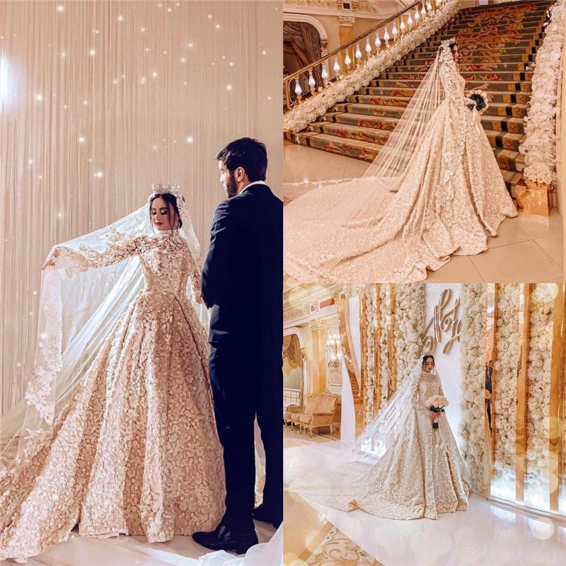 Discount Luxurious Arabic Muslim Wedding Dresses 2019 3d Floral Flowers High Neck Long Sleeve Bridal Gowns Conservative Wedding Gowns Dress Dresses