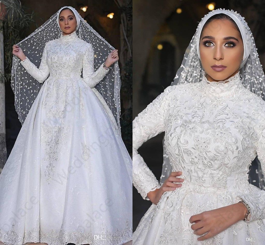 Discount 2019 Pattern Modest Muslim Wedding Dresses High Neck Long Sleeves Chapel Train White Pearls Beaded Lace Muslimah Turkey Bridal Gowns Dubai
