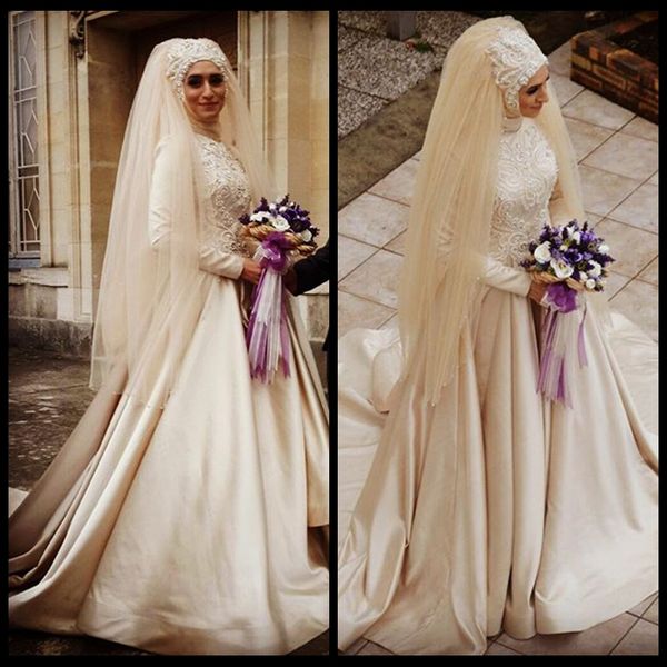 Discount 2019 Muslim Wedding Dresses Long Sleeve Champagne A Line High Neck Wedding Dress With Hijab Veil Pearls Beaded Vintage Arabic Wedding Gowns